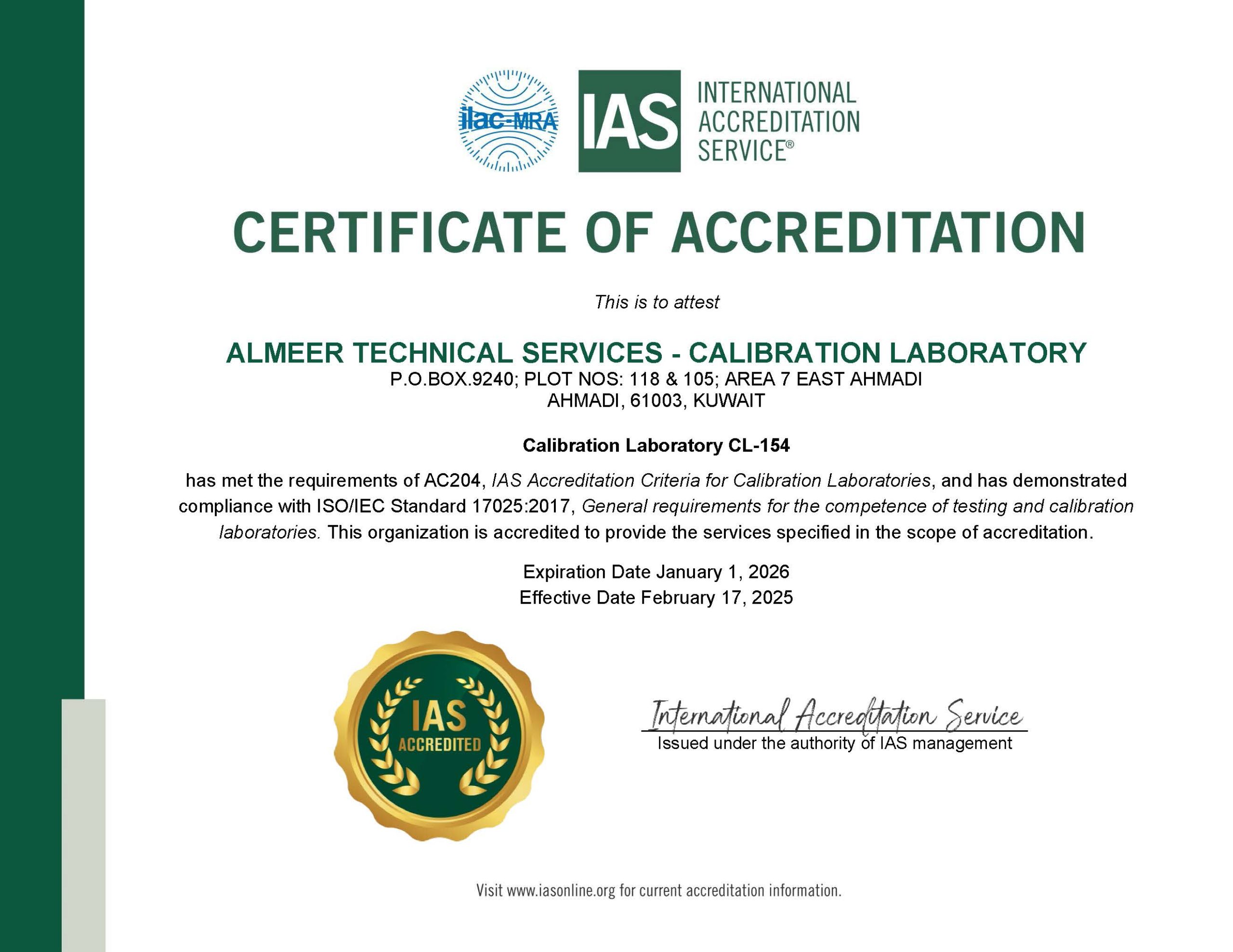 Almeer Calibration Laboratory, together with its associated branch facility in the Republic of Iraq, provides comprehensive calibration, repair, inspection, and analytical qualification services for a wide range of instruments and equipment across multiple disciplines including Dimensional, Mechanical, Pressure, Speed, Acoustic, Volume, Flow, Torque and Force, Vibration, Thermal, Electrical, RF/Microwave and Electromagnetics, Time and Frequency, Chemical, and general Metrology for clients across the Kuwait and Iraq.