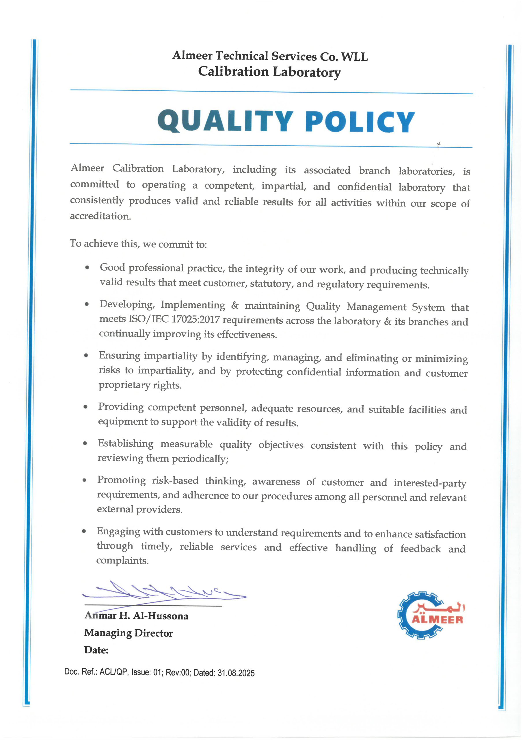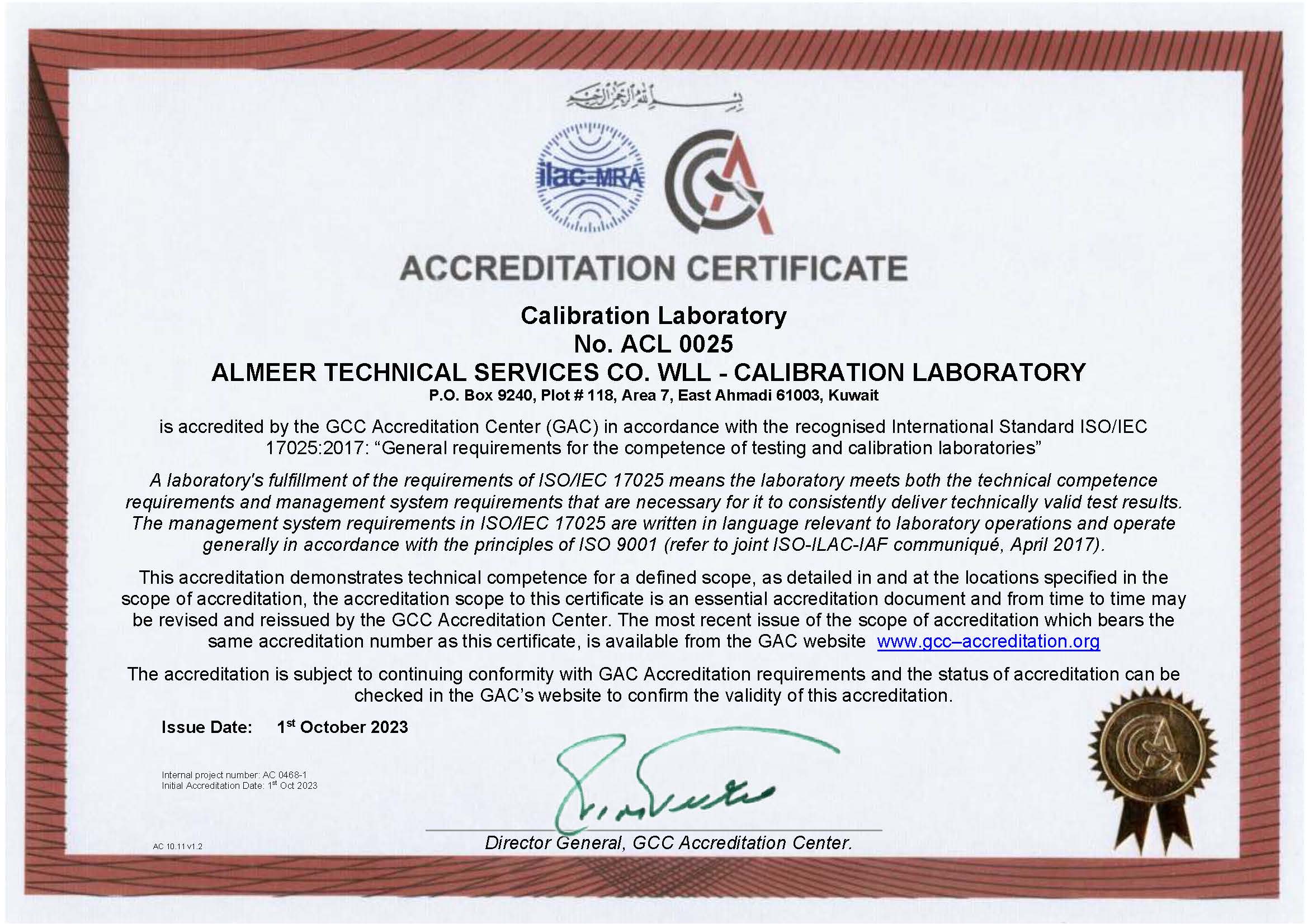 All activities at the primary lab are managed in strict compliance with ISO/IEC 17025 requirements, ensuring traceable, reliable measurement results and safeguarding customers’ assets and data integrity. Almeer maintains a robust framework to prevent conflicts of interest and protect impartiality, so that all calibration decisions remain objective, independent, and technically sound.